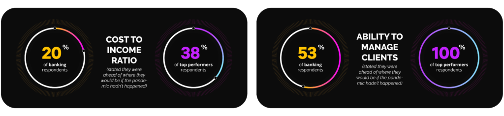 According to a recent Gartner report, the banking industry as a whole lagged behind top performers in commercial business in key metrics, including cost to income ratio (20 percent of banking respondents stated they were ahead of where they would be if the pandemic hadn’t happened, compared to 38 percent of top performers) and the ability to manage clients (53 percent of banking, compared to 100 percent of top performers).