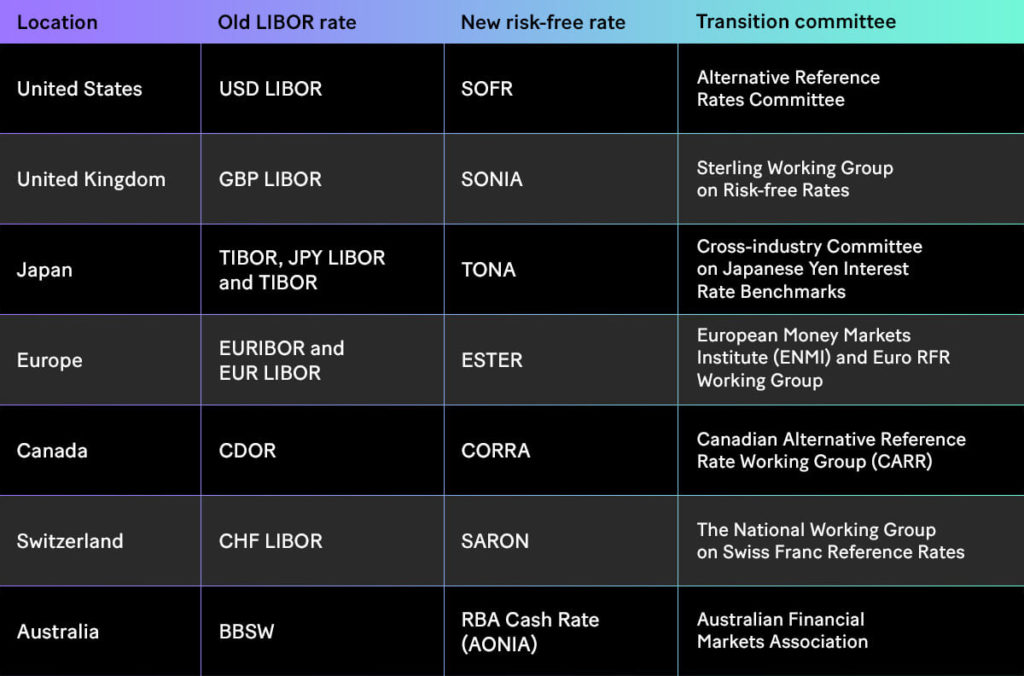 As such, the LIBOR rate is coming to an end. New benchmarks are being introduced in different locations and transition committees have been formed to oversee the changes, as outlined in the table below:
