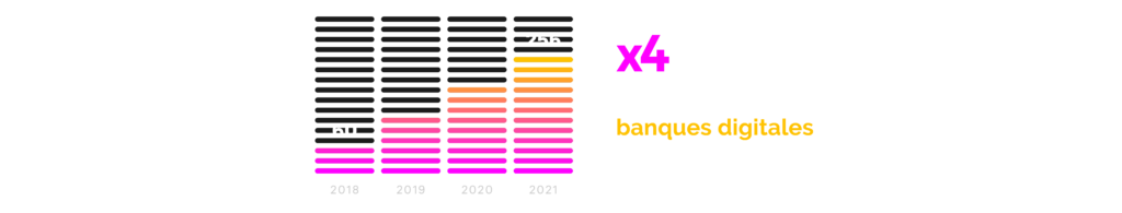 Pareillement, les organisations bancaires non traditionnelles pressentent une opportunité. Le nombre de banques digitales a explosé au cours de ces dernières années : à travers le monde, il a été multiplié par quatre entre 2018 et janvier 2021, passant de 60 à 256.