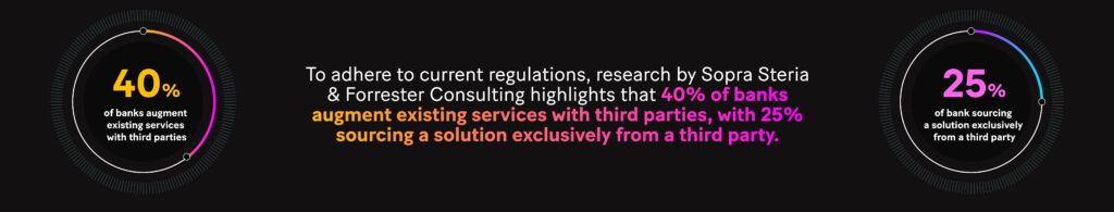 To adhere to current regulations, research by Sopra Steria and Forrester Consulting highlights that 40% of banks augment existing services with third parties, with 25% sourcing a solution exclusively from a third party (average figures across 15 capabilities). With PSD3, PSR, and FIDA on the horizon, compliance, strategic, operational, and technological requirements are changing. To meet those needs, forward-thinking third parties like SBS will need to update their offerings accordingly.