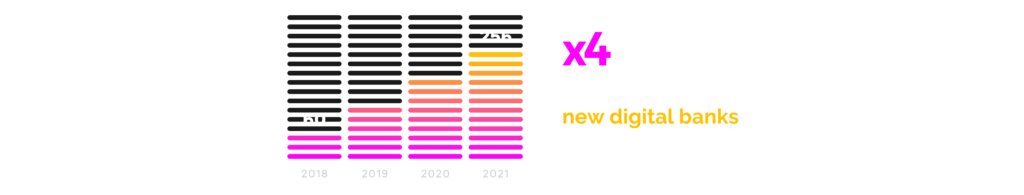 Likewise, non-legacy bank organizations sense an opportunity. The number of new digital banks being created has risen exponentially in recent years, quadrupling from 60 worldwide in 2018 to 256 in January of this year.