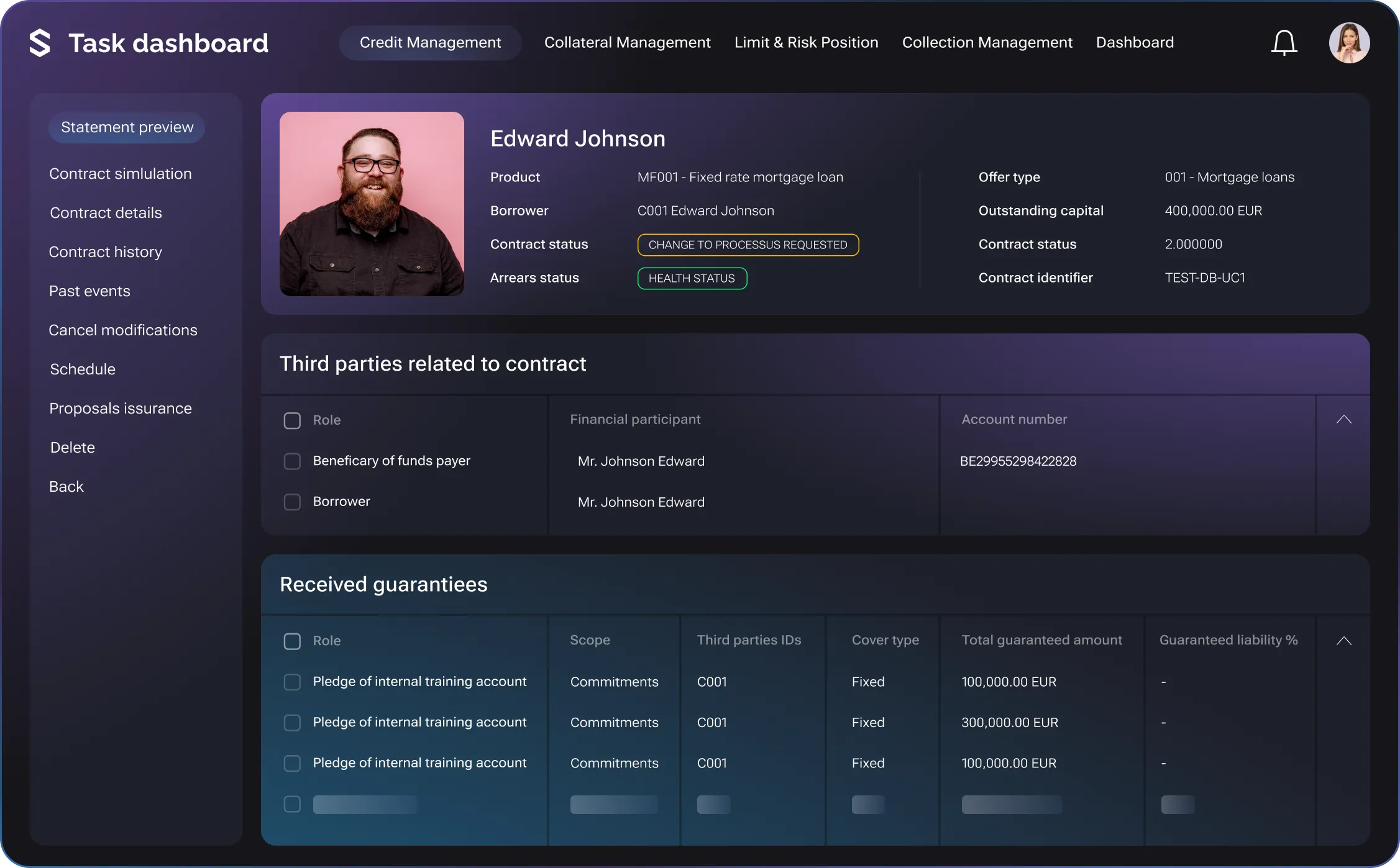 Que vous cherchiez à accélérer l’analyse et la gestion des risques, à calculer des scores ou à réduire votre exposition à la fraude, notre solution basée sur l’IA s’adapte à vos besoins — que ce soit en gestion des garanties, des contreparties ou des notations.